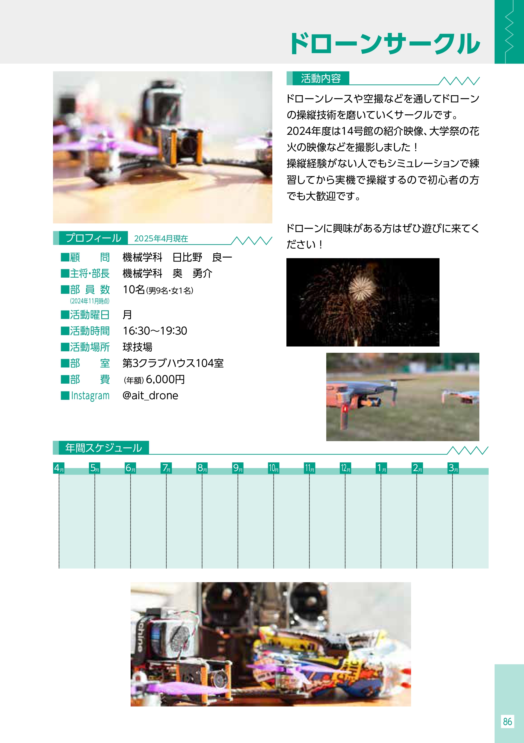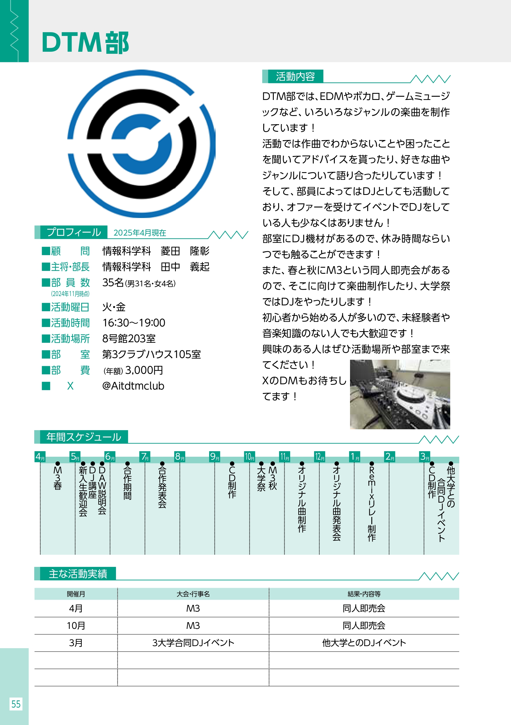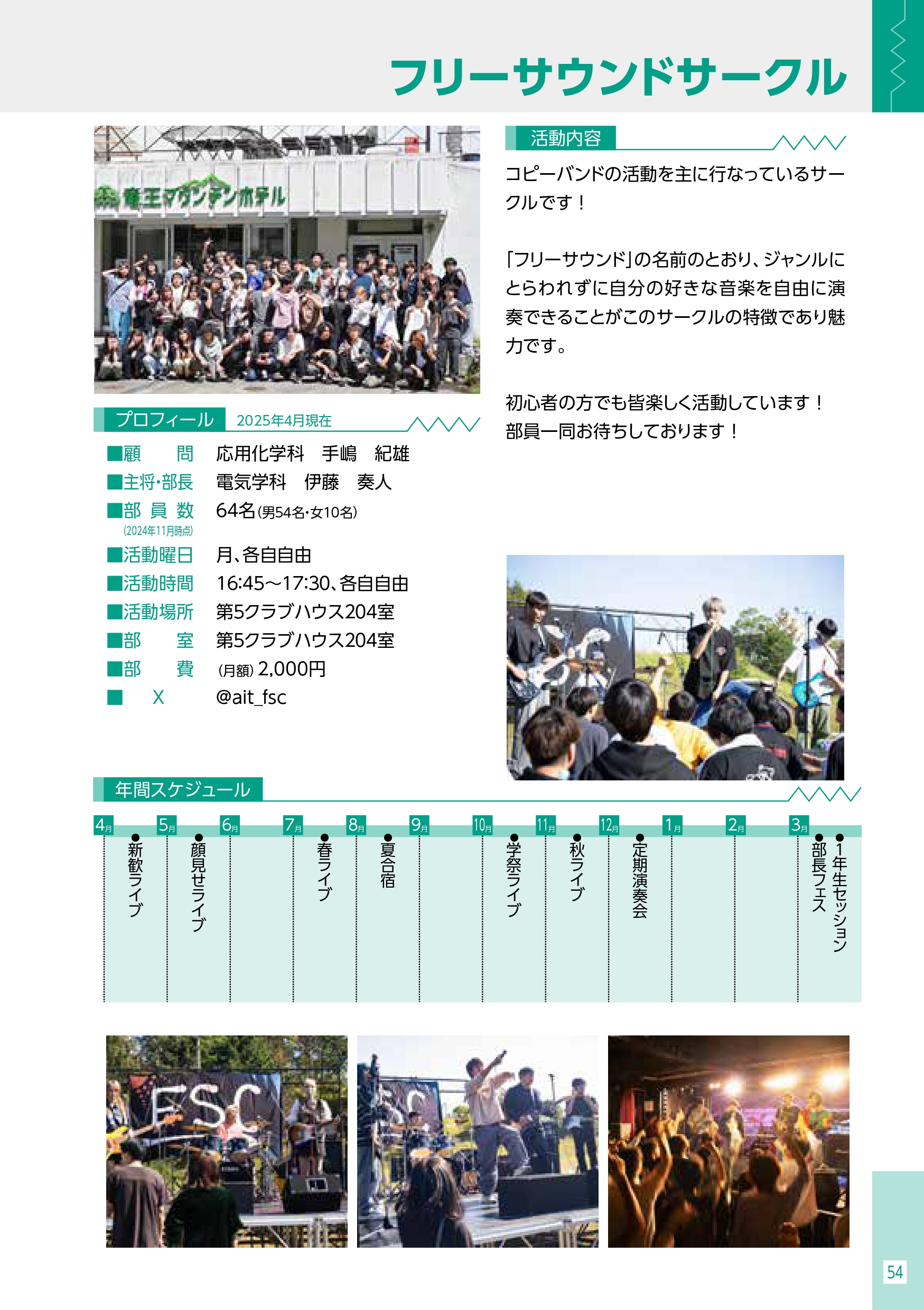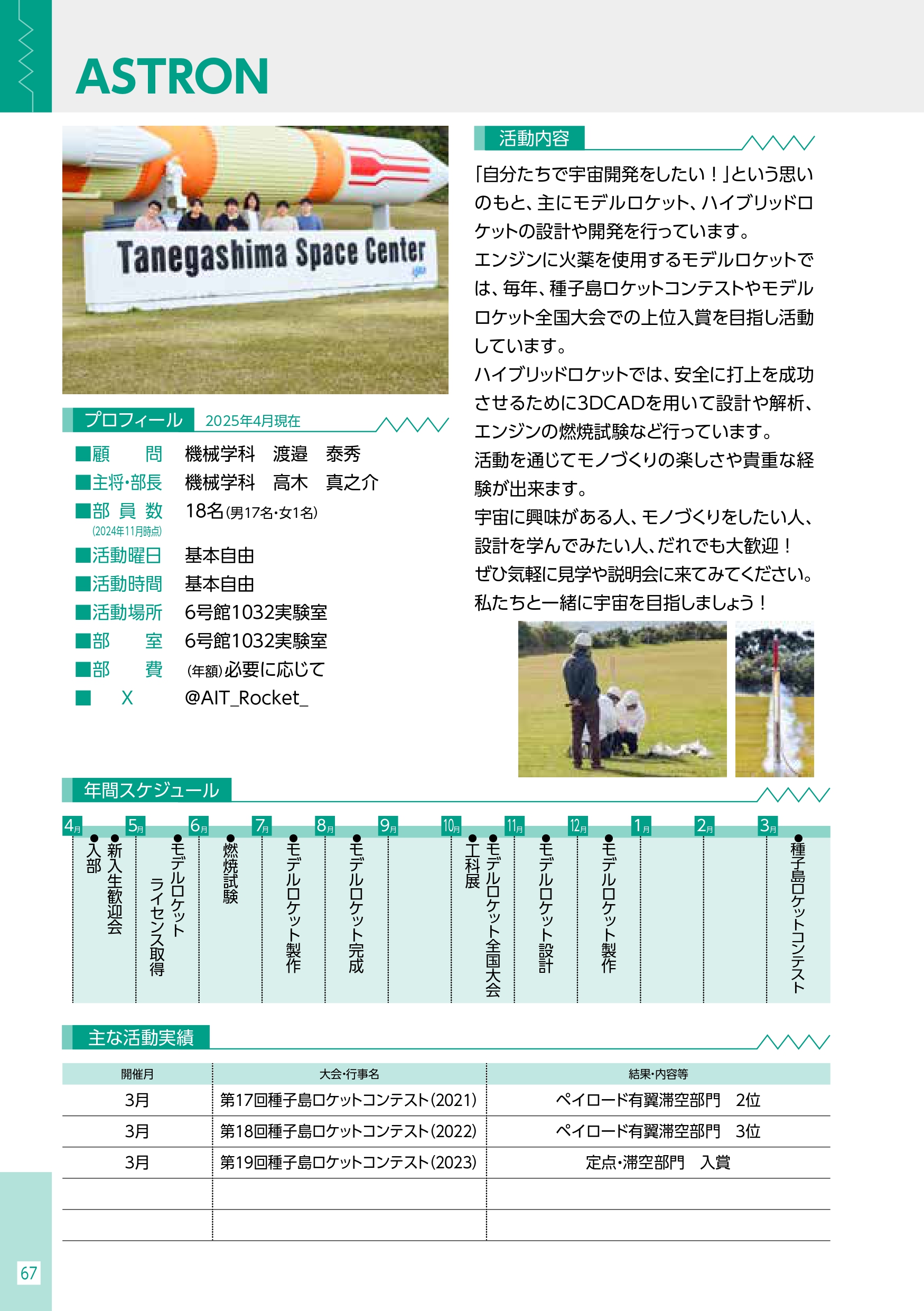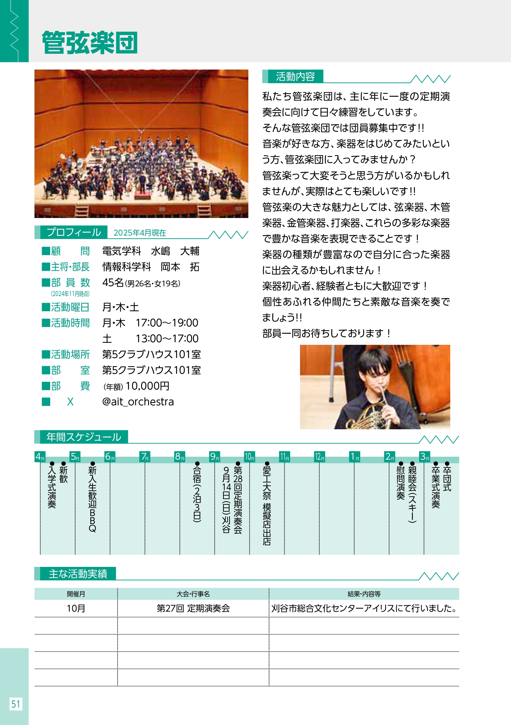 クラブ一覧 管弦楽団 ギター部 軽音楽部 フリーサウンドサークル DTM部 なんくるないさ~くる 競技バンド部 漫画動画研究会 現代視覚文化研究会 サブカルチャー研究会 システム工学研究会 土木研究会 レスキューロボット研究会 AIT学生フォーミュラ研究会 AITEP Robot-Art ASTRON AIT株式研究会 ~Beckoning Cat~ 飛行ロボット研究会 建築研究会 リノベサークル コンテンツクリエーションサークル CG制作部 SL 同好会 マルチクリエイティブサークル フィッシング部 写真研究部 囲碁・将棋部 鉄道研究部 創作サークル みらい工房物創りクラブ Cooking Community Circle「Hill's」 麻雀サークル 自由ヶ丘ボードゲームサークル e-Sports Community Circle ドローンサークル 自由ヶ丘サウナサークル SPREAT