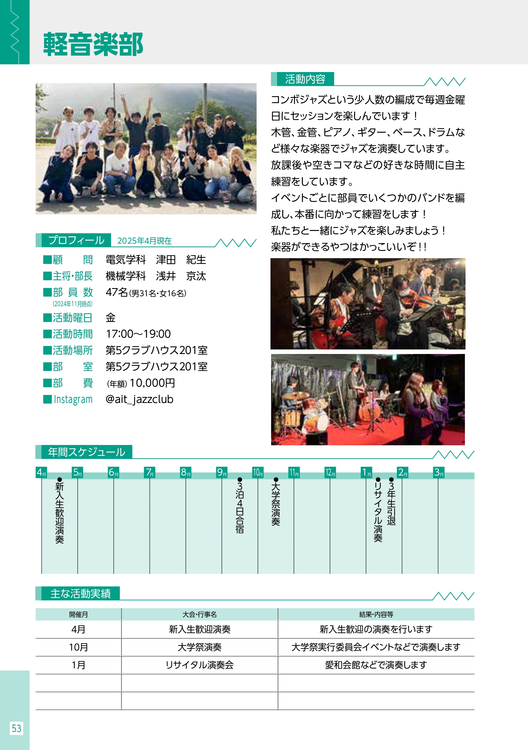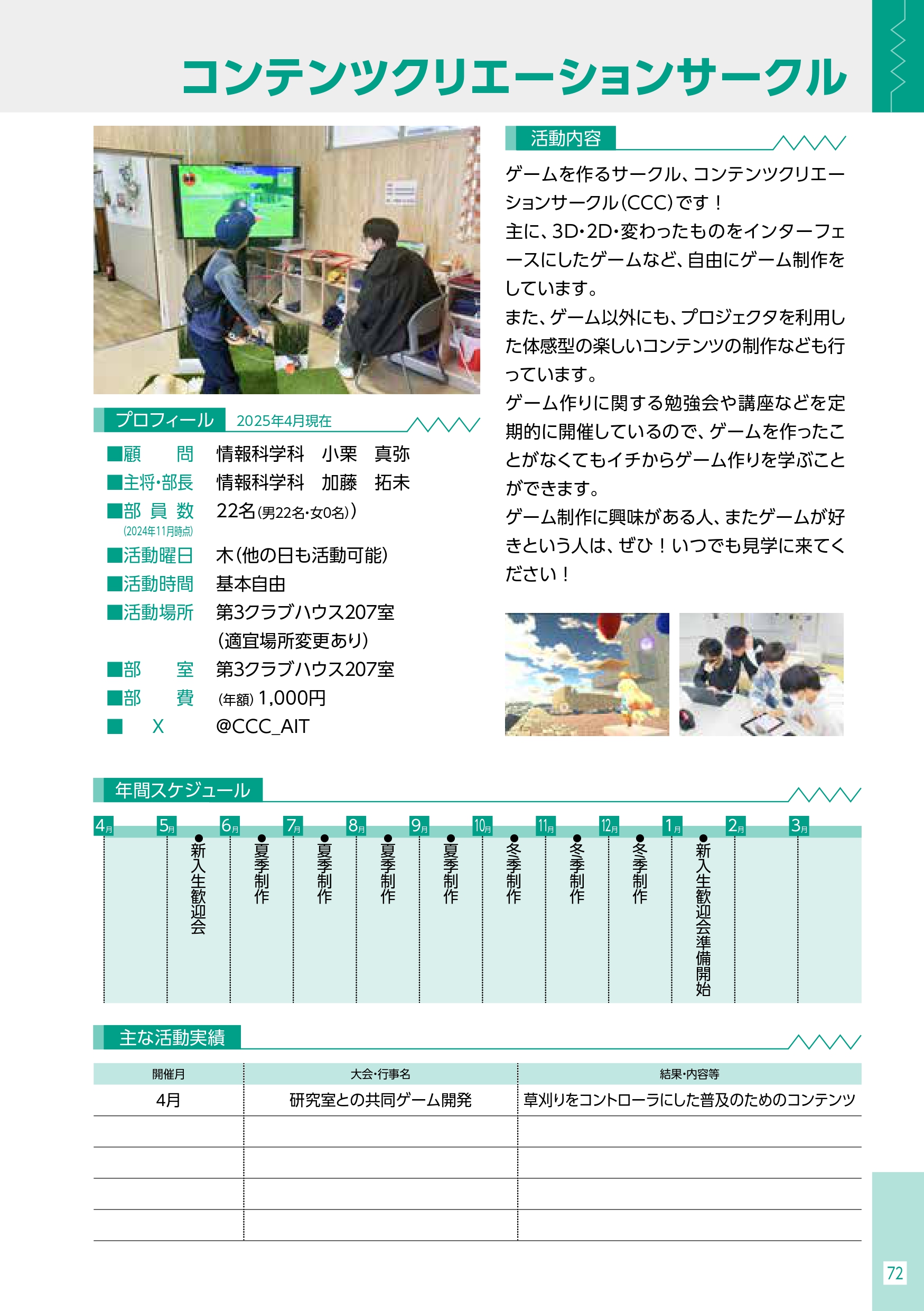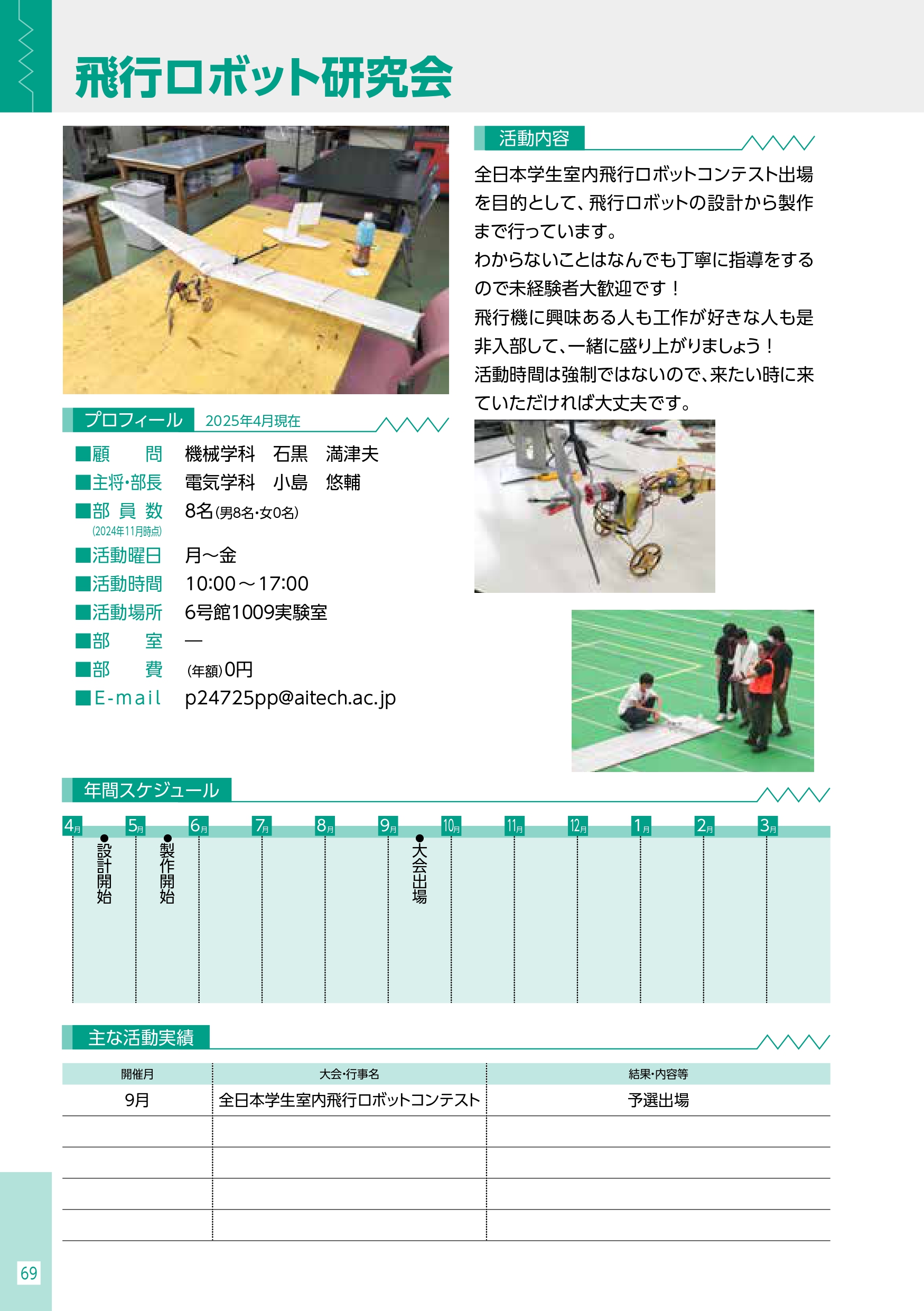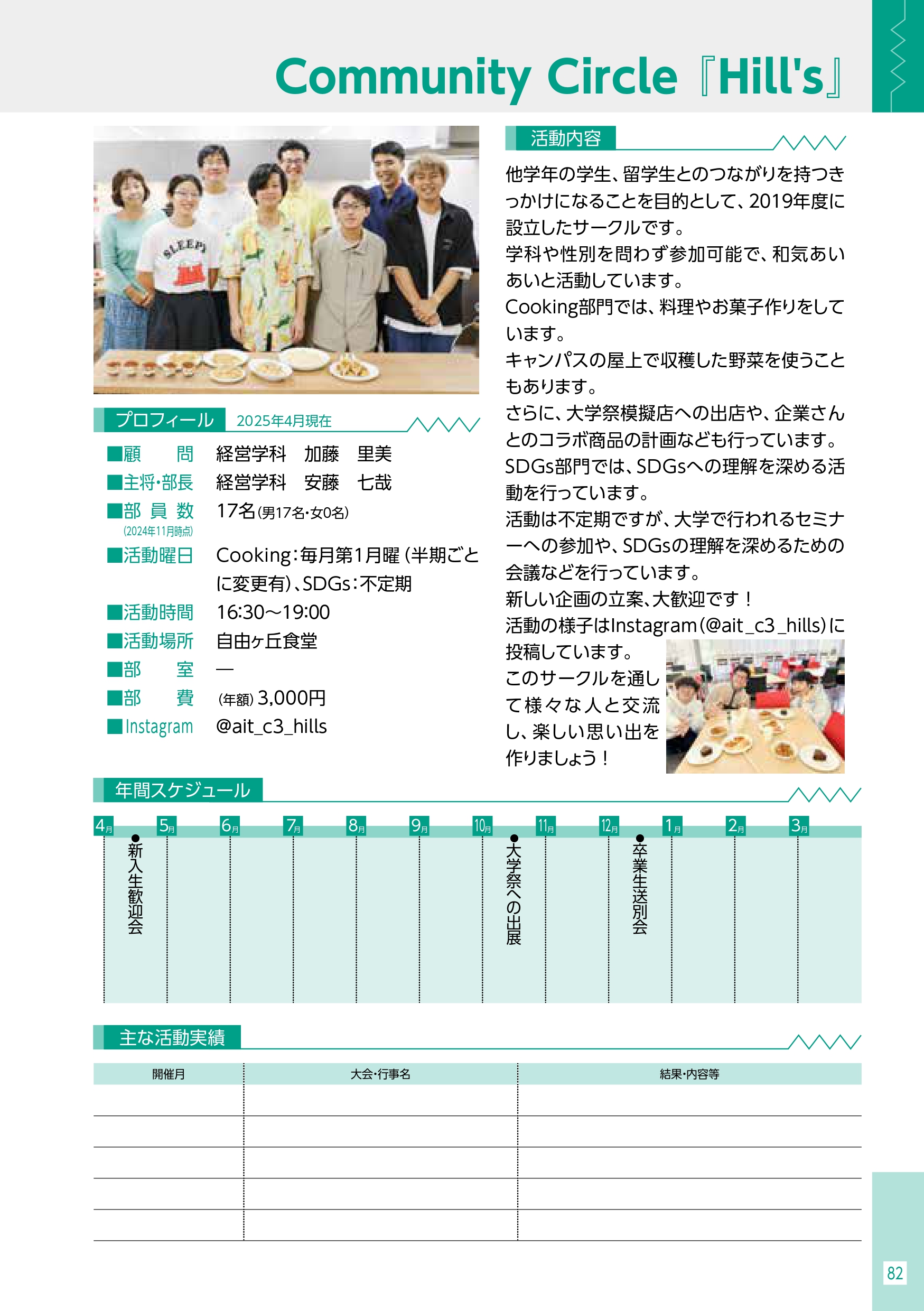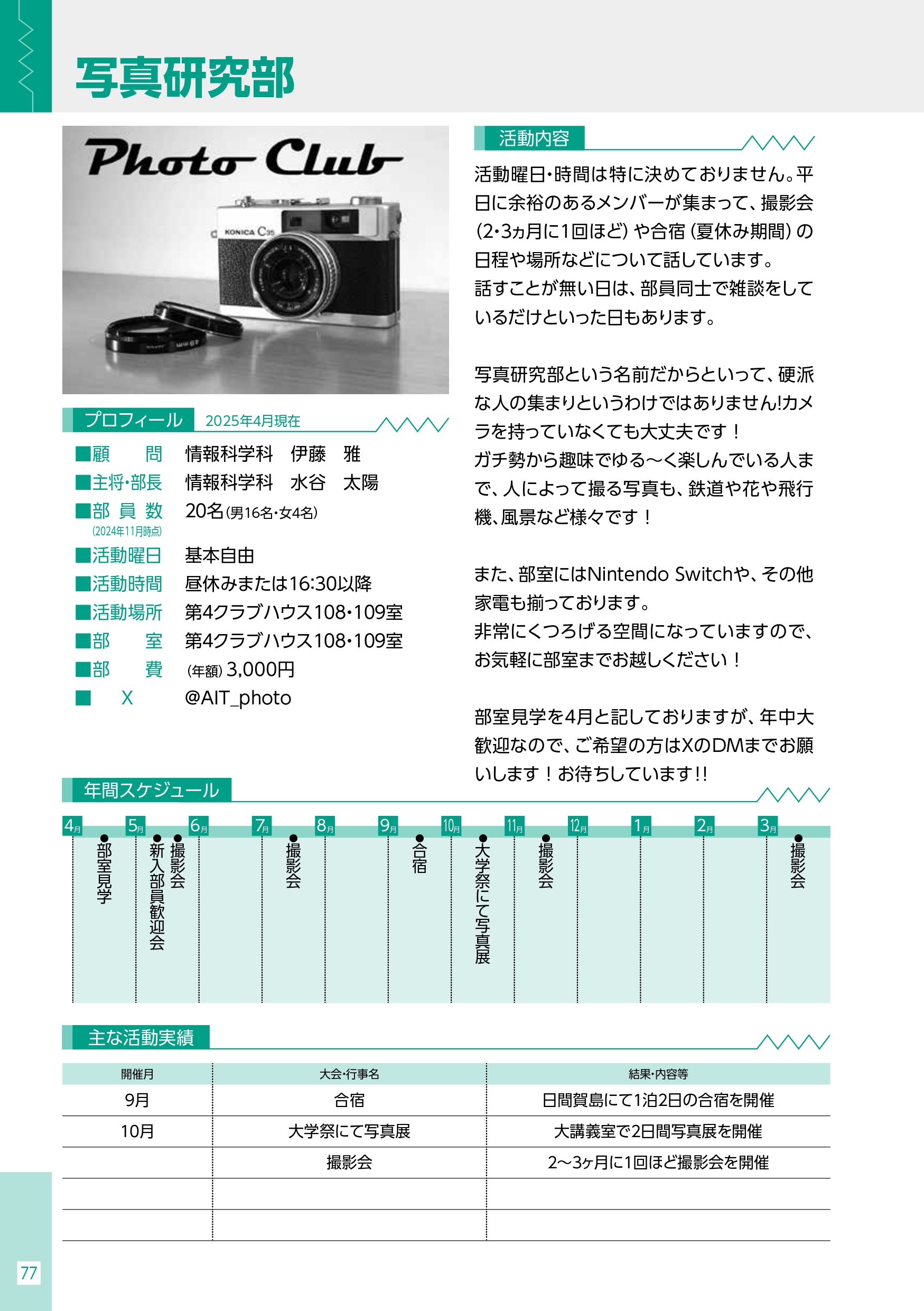 クラブ一覧 管弦楽団 ギター部 軽音楽部 フリーサウンドサークル DTM部 なんくるないさ~くる 競技バンド部 漫画動画研究会 現代視覚文化研究会 サブカルチャー研究会 システム工学研究会 土木研究会 レスキューロボット研究会 AIT学生フォーミュラ研究会 AITEP Robot-Art ASTRON AIT株式研究会 ~Beckoning Cat~ 飛行ロボット研究会 建築研究会 リノベサークル コンテンツクリエーションサークル CG制作部 SL 同好会 マルチクリエイティブサークル フィッシング部 写真研究部 囲碁・将棋部 鉄道研究部 創作サークル みらい工房物創りクラブ Cooking Community Circle「Hill's」 麻雀サークル 自由ヶ丘ボードゲームサークル e-Sports Community Circle ドローンサークル 自由ヶ丘サウナサークル SPREAT