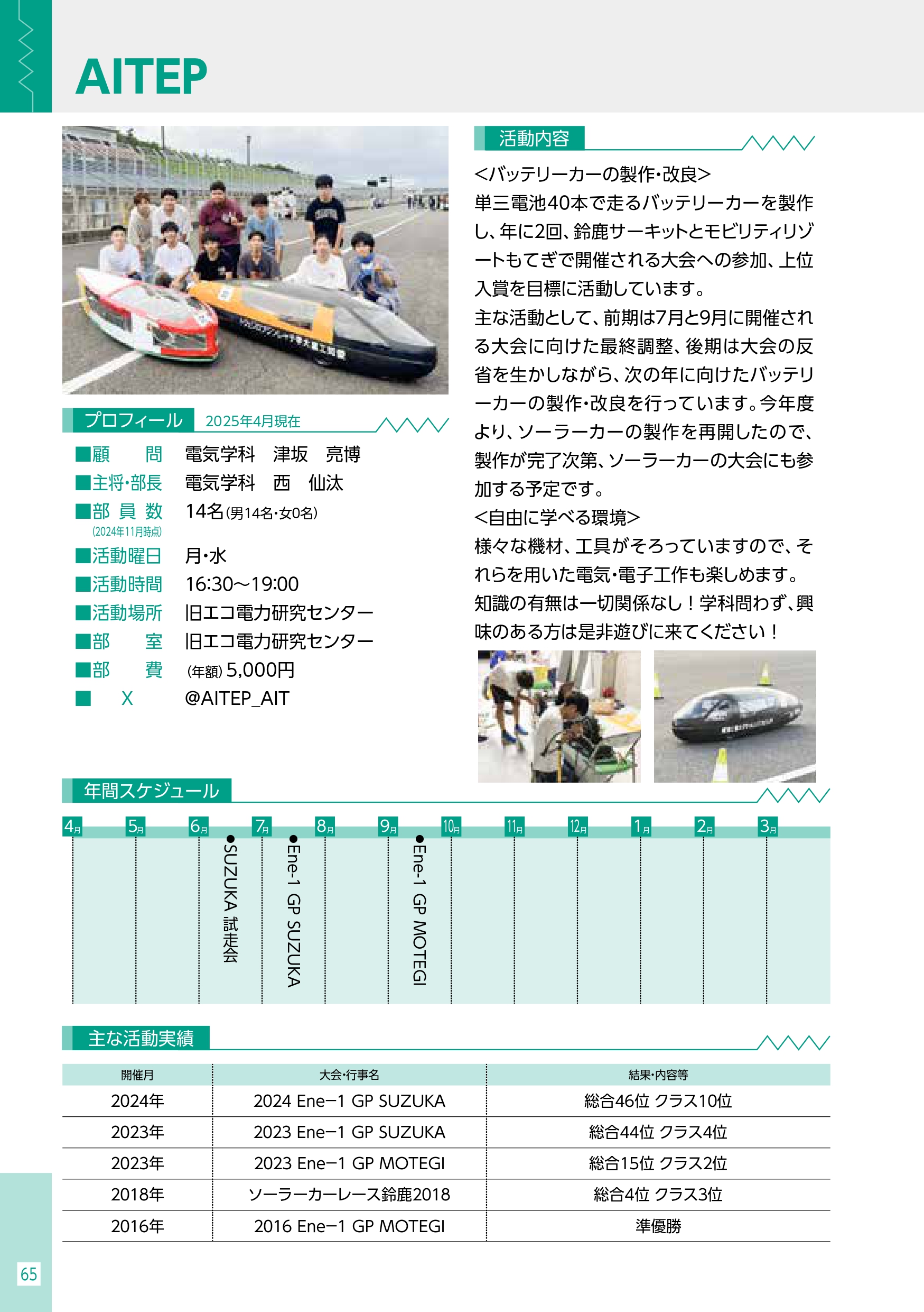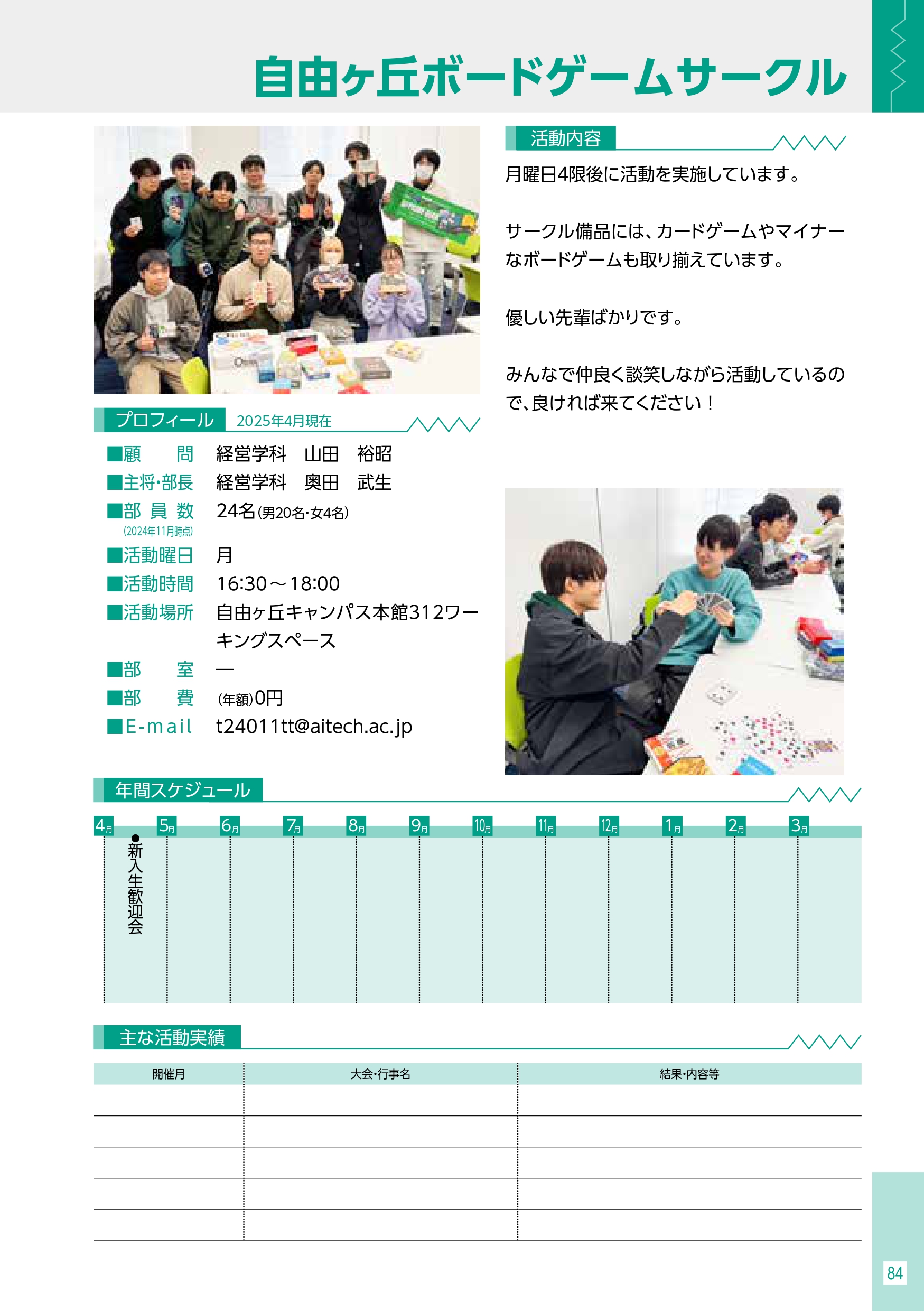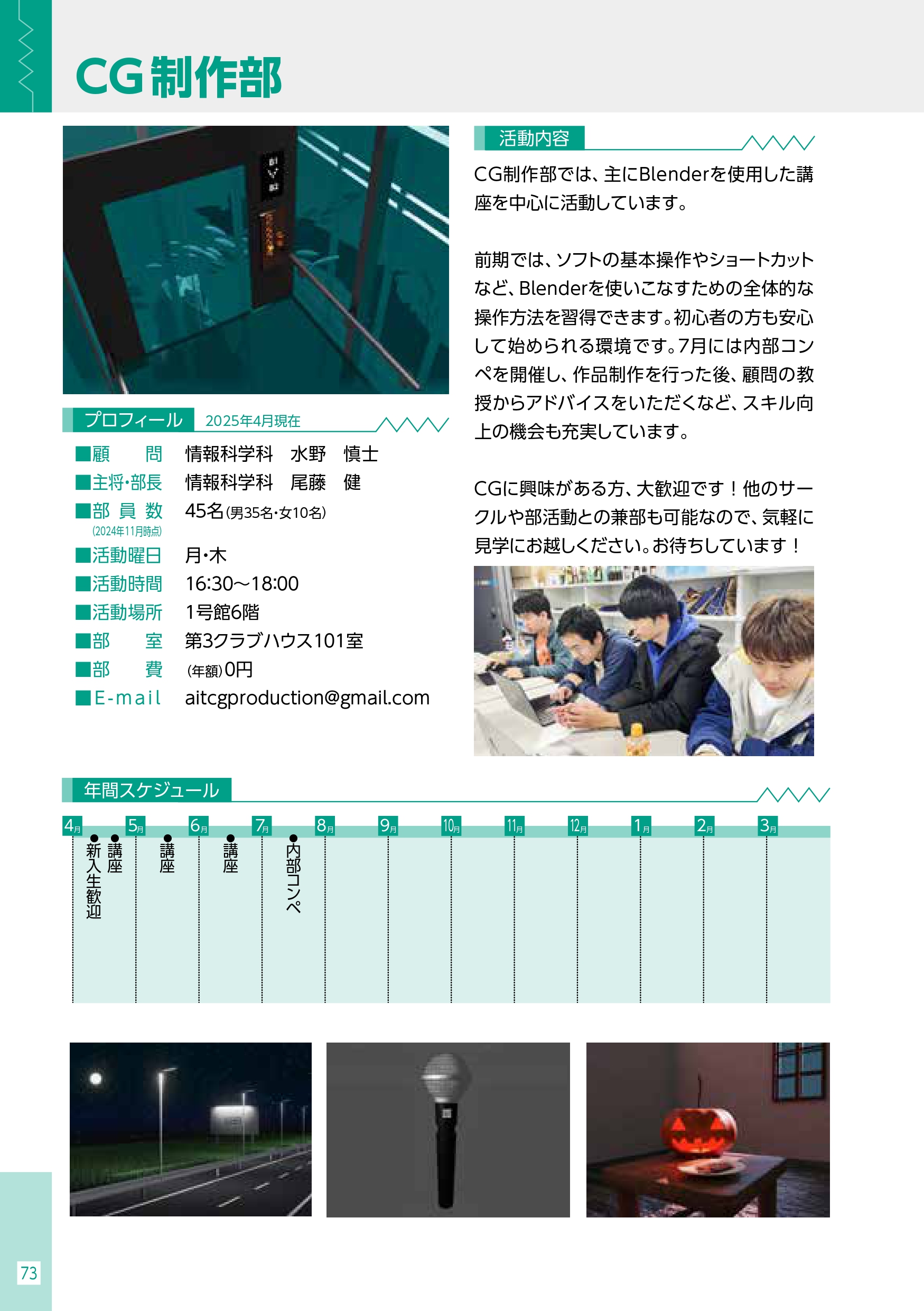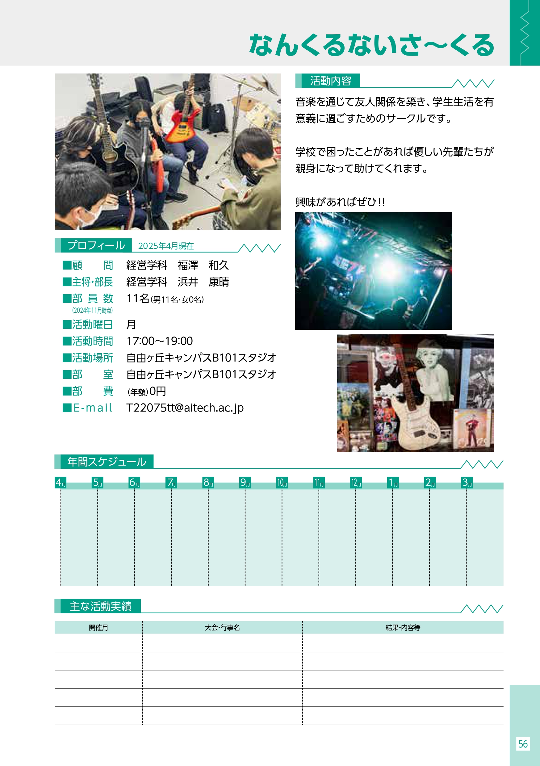 クラブ一覧 管弦楽団 ギター部 軽音楽部 フリーサウンドサークル DTM部 なんくるないさ~くる 競技バンド部 漫画動画研究会 現代視覚文化研究会 サブカルチャー研究会 システム工学研究会 土木研究会 レスキューロボット研究会 AIT学生フォーミュラ研究会 AITEP Robot-Art ASTRON AIT株式研究会 ~Beckoning Cat~ 飛行ロボット研究会 建築研究会 リノベサークル コンテンツクリエーションサークル CG制作部 SL 同好会 マルチクリエイティブサークル フィッシング部 写真研究部 囲碁・将棋部 鉄道研究部 創作サークル みらい工房物創りクラブ Cooking Community Circle「Hill's」 麻雀サークル 自由ヶ丘ボードゲームサークル e-Sports Community Circle ドローンサークル 自由ヶ丘サウナサークル SPREAT