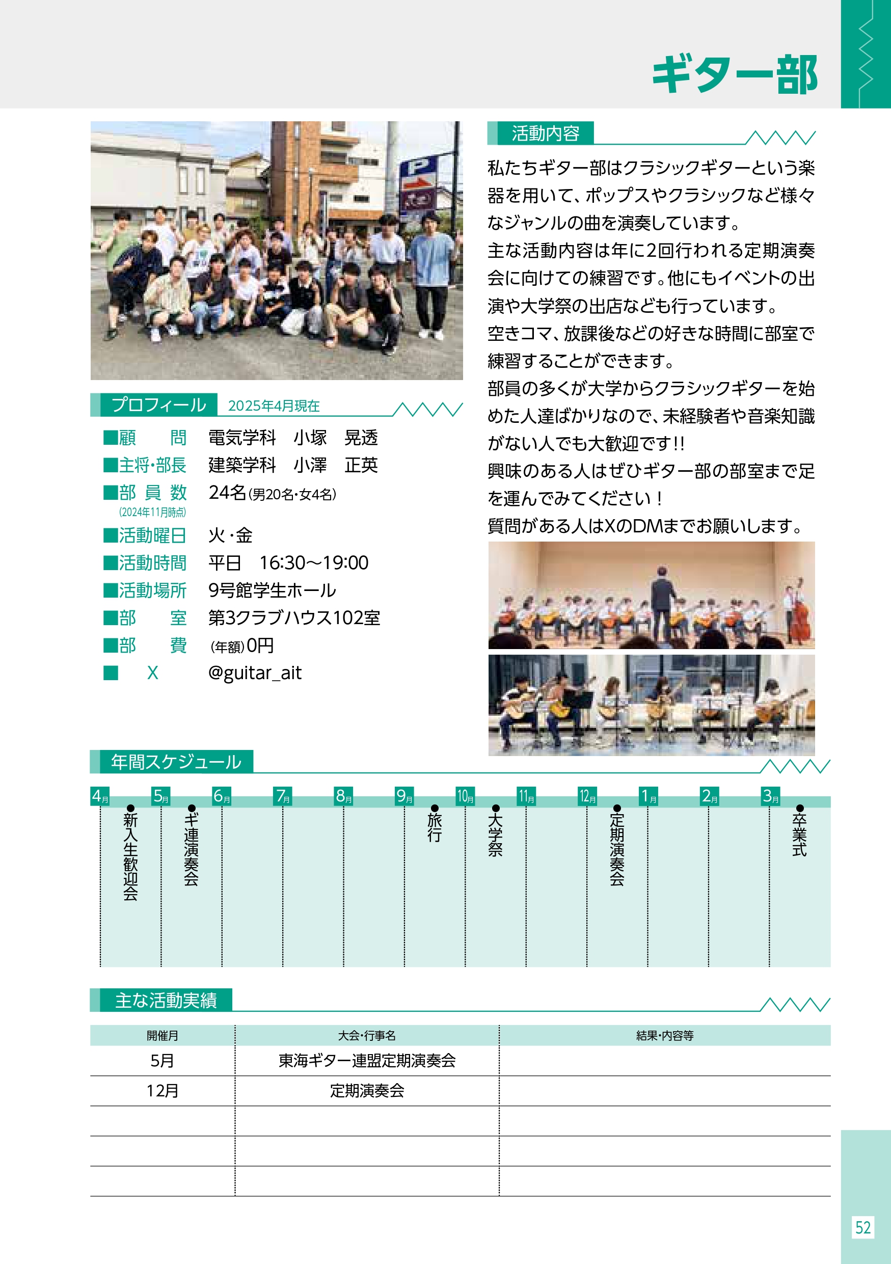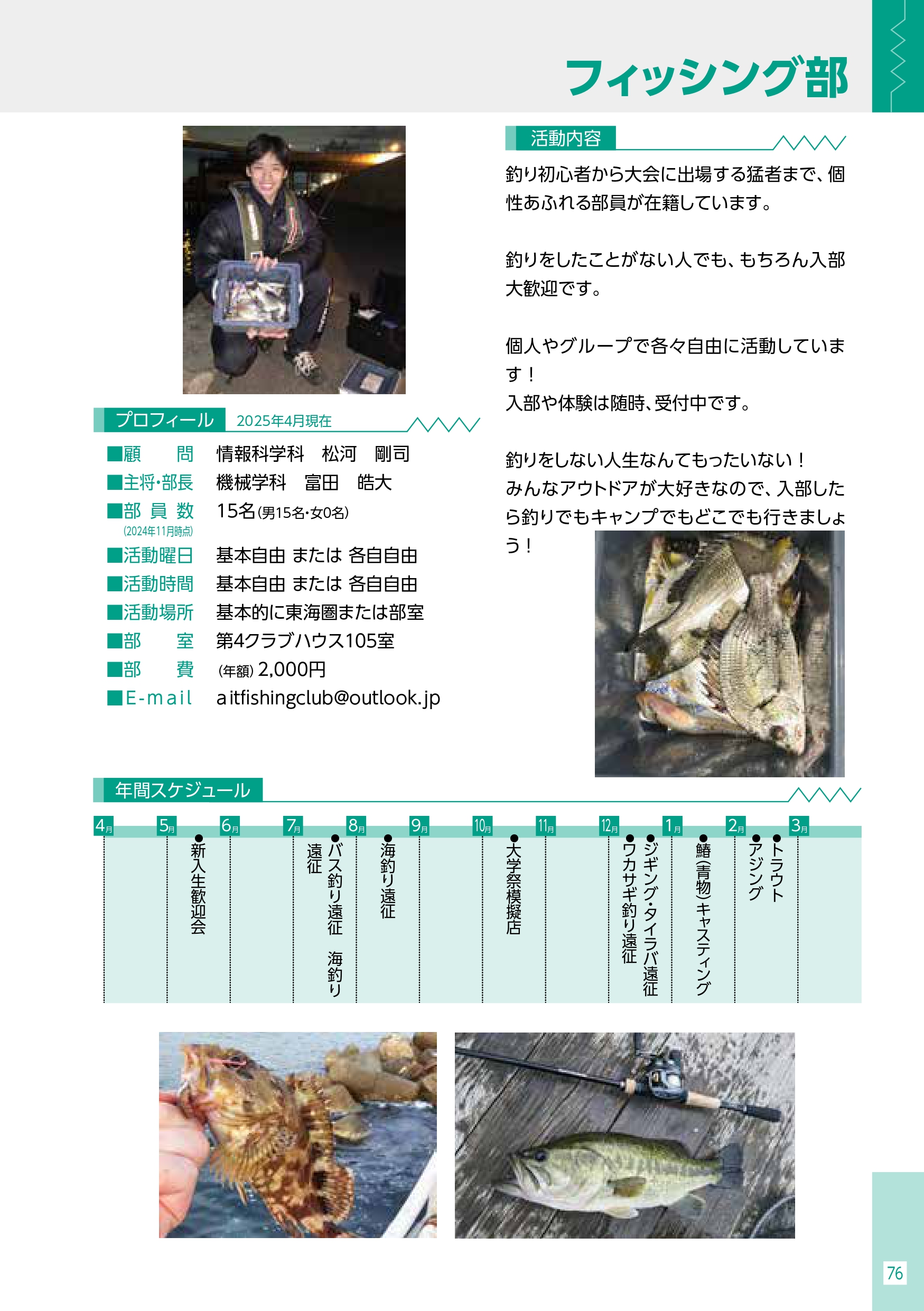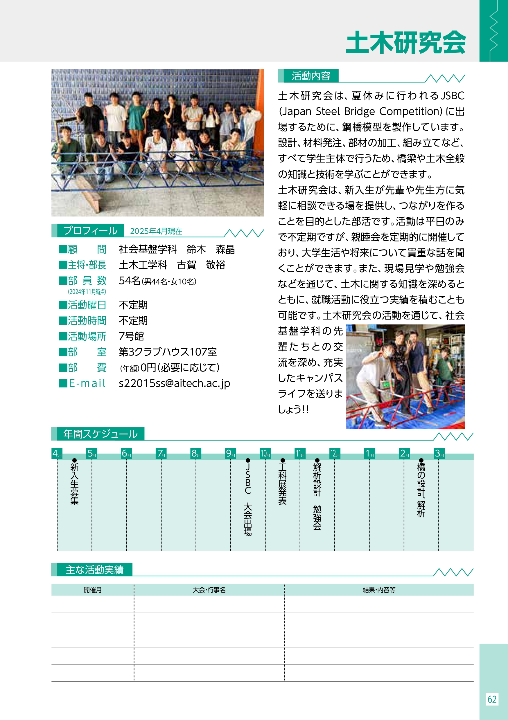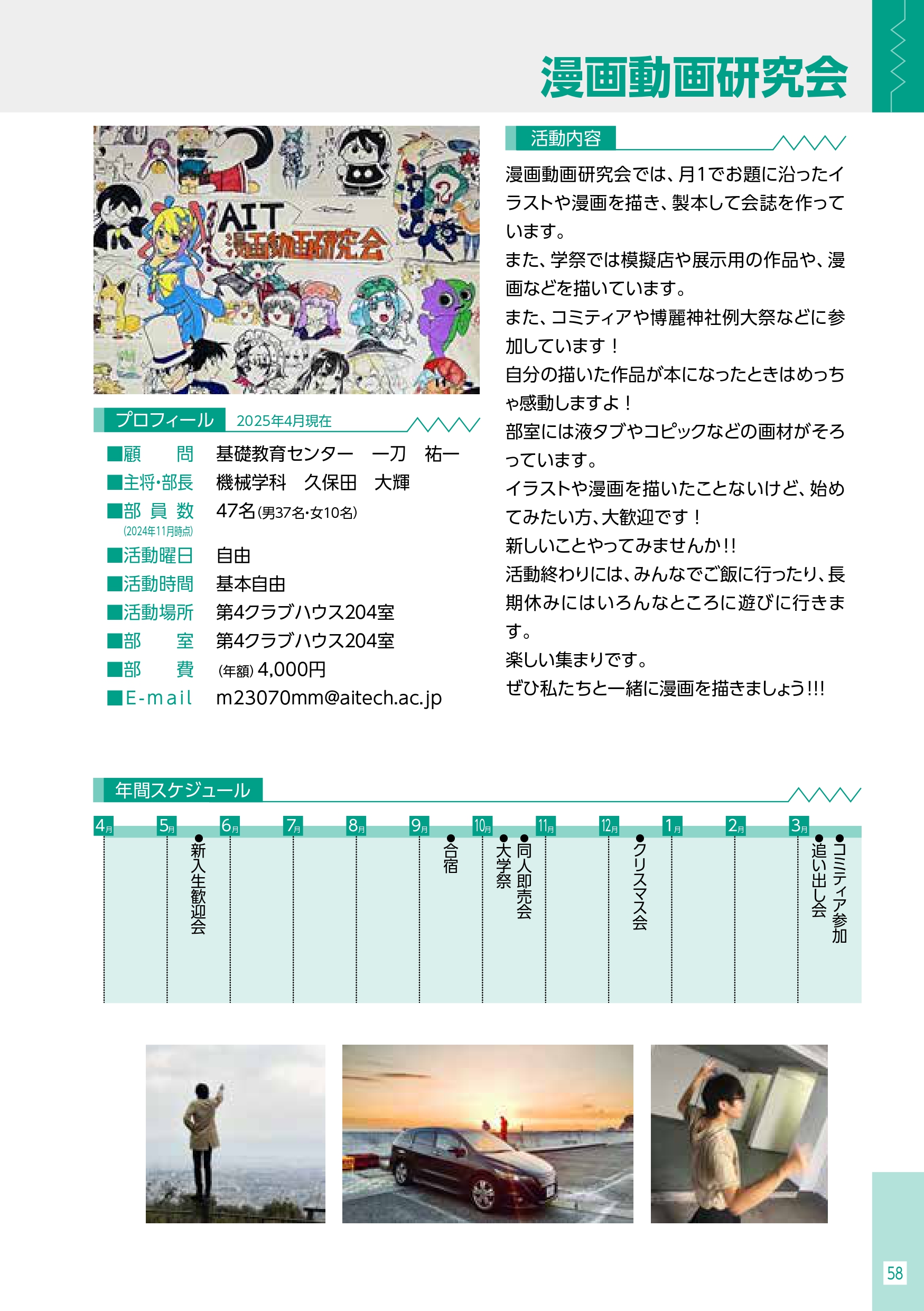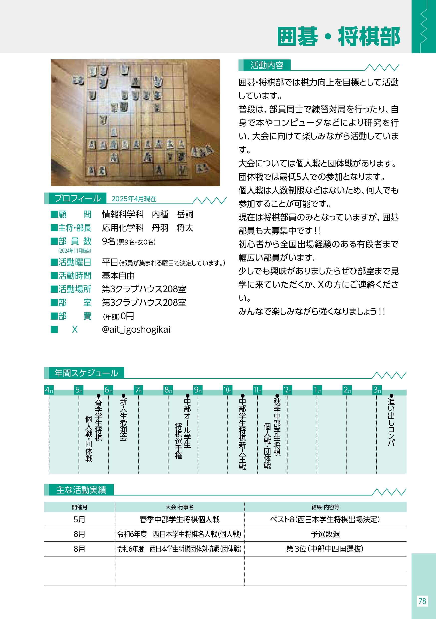 クラブ一覧 管弦楽団 ギター部 軽音楽部 フリーサウンドサークル DTM部 なんくるないさ~くる 競技バンド部 漫画動画研究会 現代視覚文化研究会 サブカルチャー研究会 システム工学研究会 土木研究会 レスキューロボット研究会 AIT学生フォーミュラ研究会 AITEP Robot-Art ASTRON AIT株式研究会 ~Beckoning Cat~ 飛行ロボット研究会 建築研究会 リノベサークル コンテンツクリエーションサークル CG制作部 SL 同好会 マルチクリエイティブサークル フィッシング部 写真研究部 囲碁・将棋部 鉄道研究部 創作サークル みらい工房物創りクラブ Cooking Community Circle「Hill's」 麻雀サークル 自由ヶ丘ボードゲームサークル e-Sports Community Circle ドローンサークル 自由ヶ丘サウナサークル SPREAT