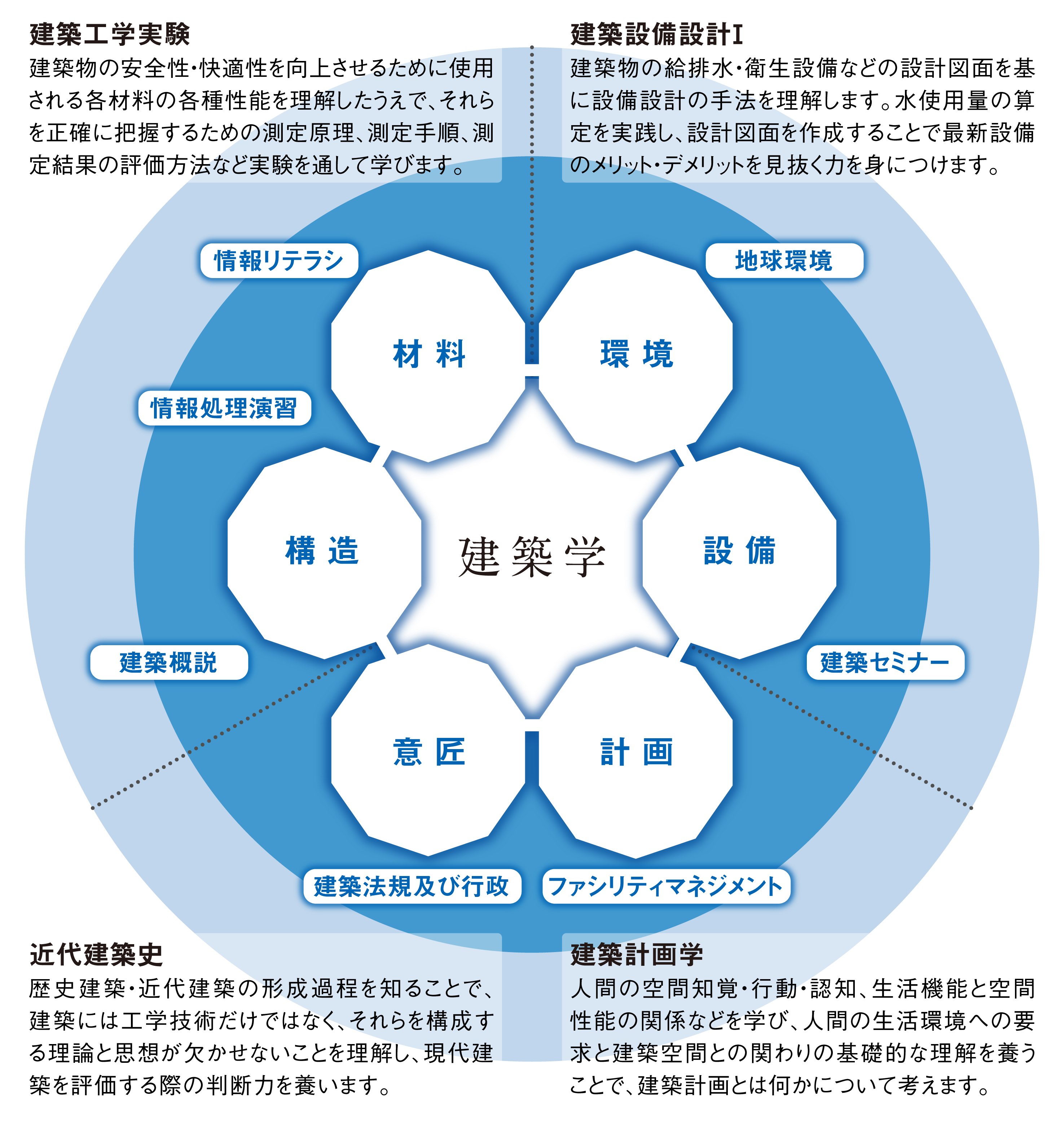 住宅、商業施設、学校、中高層ビル、都市計画などをテーマに「計画・意匠」「構造・材料」「環境・設備」の3分野を学び、総合力のある専門家を育成。芸術性、機能性、安全性のすべてを備えた理想の建築物の実現をめざし、高度な実践力を養います。