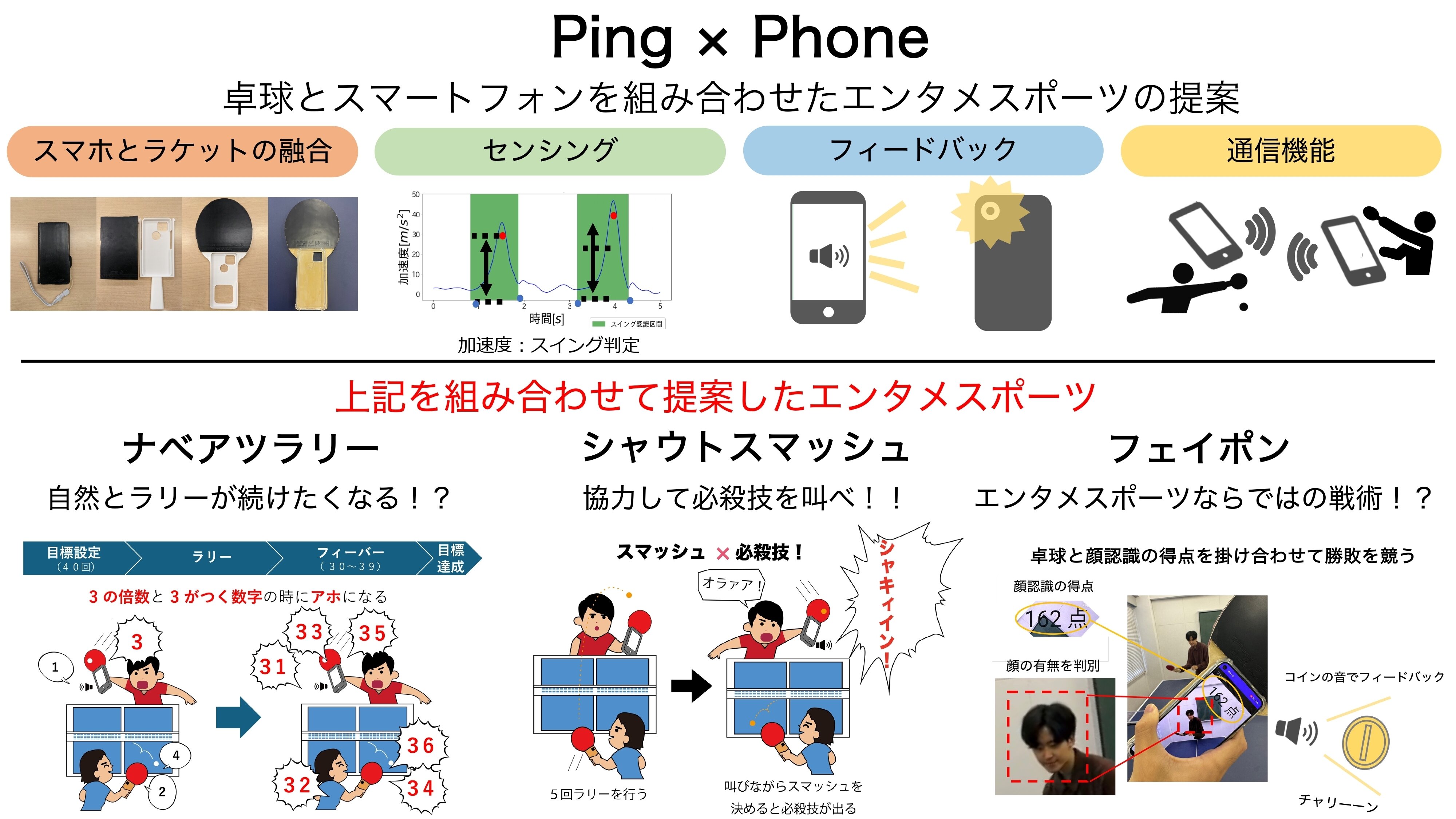 エンタメスポーツをさらに発展させる手段の一つとして、スマートフォンならではの機能を用い、ラケット型のスマートフォンケースの作成、スマートフォンに内蔵されているセンサを用いたセンシング、スマートフォンならではの機能を用いたフィードバック、通信機能を組み合わせたエンタメアプリケーションを実装しました。自然とラリーを続けたくなる"ナベアツラリー"、協力して必殺技を叫ぶシャウトスマッシュ、さまざまな戦術が生まれる顔認識を用いたフェイポンの3つを制作しました。