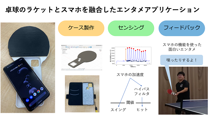 全国規模の学生限定コンテストに、今回は95件の応募がありました。「Ping×Phone」と名付けた瀧沢さんたちのアプリは、スマホカバーを利用してスマホを取り付けた卓球ラケットを作り、新しいエンタメを作り出そうというものです。ユーザーが実際に卓球台でボールを打ち合うと、加速度センサの値から空振り・ヒットの判定が行われ、今回はラリー回数をスマホ機能の音声でアナウンスする機能を実装しました。このほかにもカメラや振動の機能を使って視覚や触覚に働きかけるエンタメが考えられるといいます。
