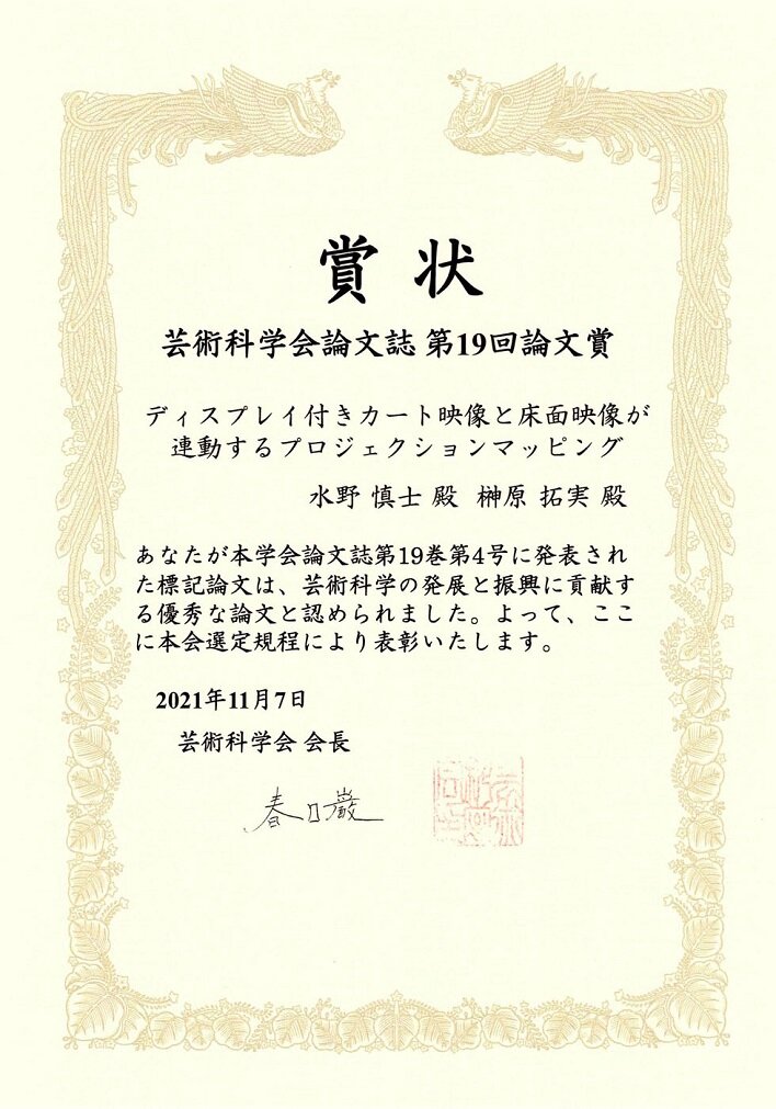 情報科学科の水野慎士教授とCGメディア研究室OBの榊原拓実さんが芸術科学会に投稿した論文「ディスプレイ付きカート映像と床面映像が連動するプロジェクションマッピング」が、芸術科学会論文誌に昨年6月から今年3月までに採録された論文の中、最も優れた2本の論文の1つに選定され、第19回論文賞を受賞しました。