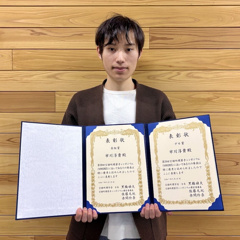 自然言語処理学研究室の市川さんが第20回言語処理若手シンポジウムで受賞