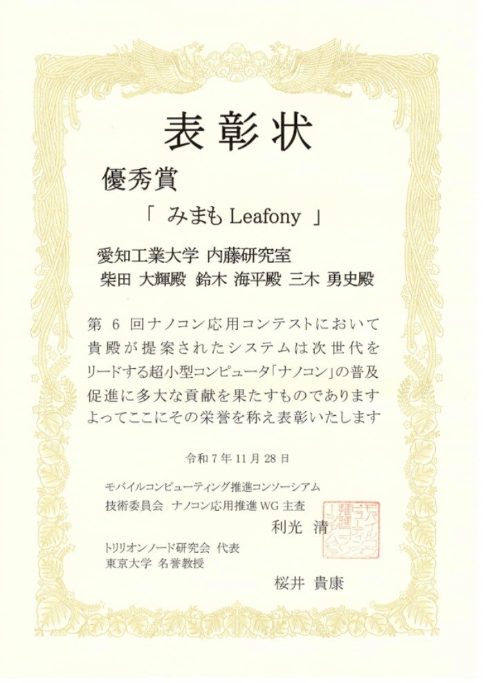 モバイルコンピューティング研究室の学生らが第6回ナノコン応用コンテストで優秀賞