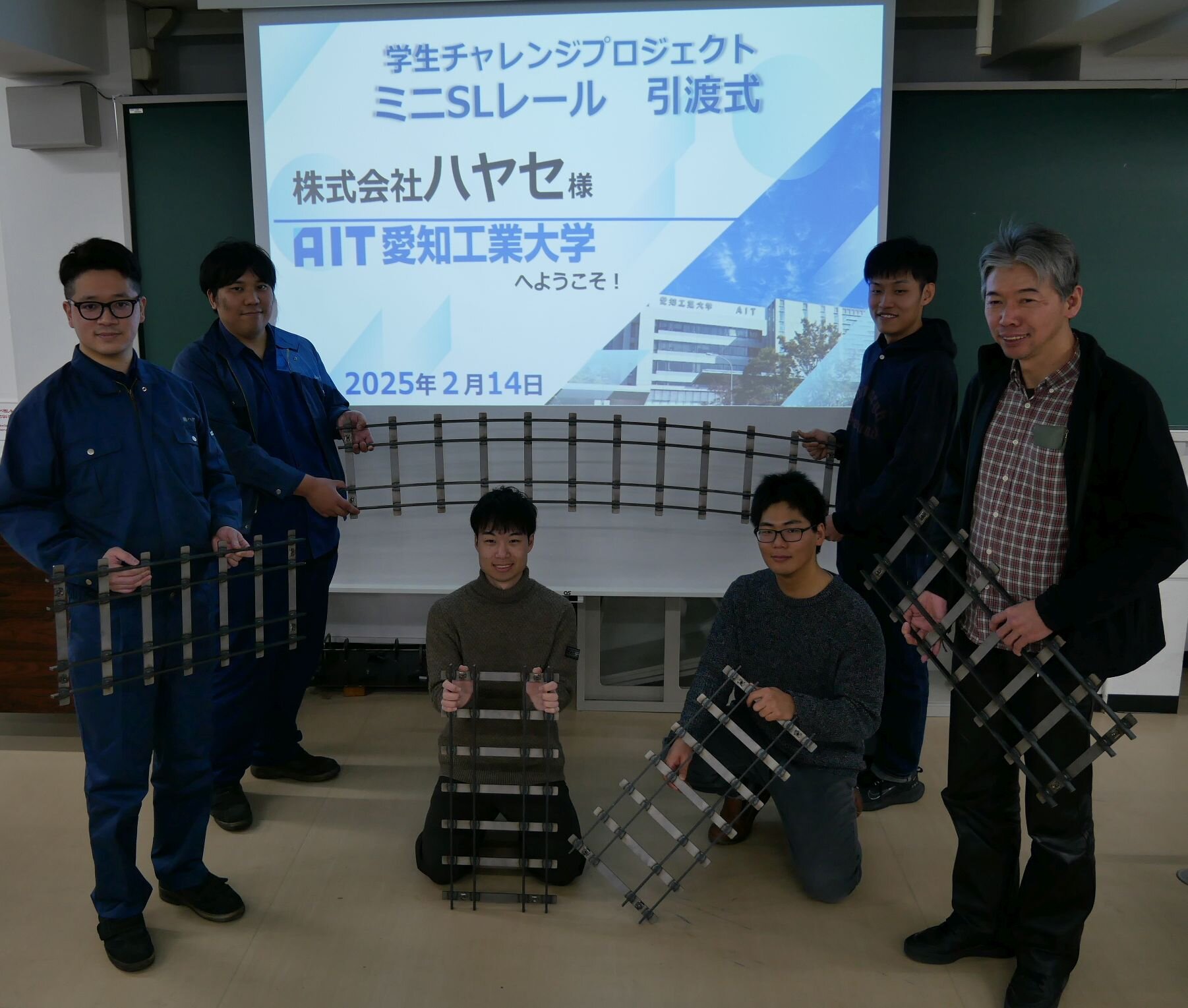 学生チャレンジプロジェクト「蒸気機関車のレストアと各イベントの出展」が取り組むミニSL走行用のレールの製作に協力した株式会社ハヤセ(本社名古屋市中川区・早瀬俊充社長)から、レールの引き渡しが2月14日に八草キャンパス6号館で行われました。