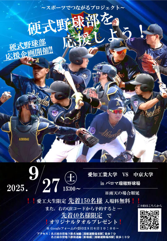 硬式野球部の対中京大学戦(9月27日(土))を、球場で応援しましょう!
