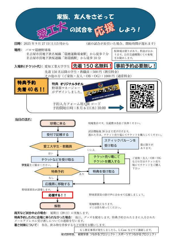 愛知工業大学の学生は当日先着 150 人まで無料です。それ以降に来た方は割引チケットによる 500円 で観戦可能です。また、8月6日10:00から予約開始の特典予約では、応援グッズとして、先着40名にタオルが渡されます。当日の応援方法は、野球部部員に合わせる形式になります。ご家族の方(チケット代は通常料金になります)なども誘って、皆で応援しましょう!