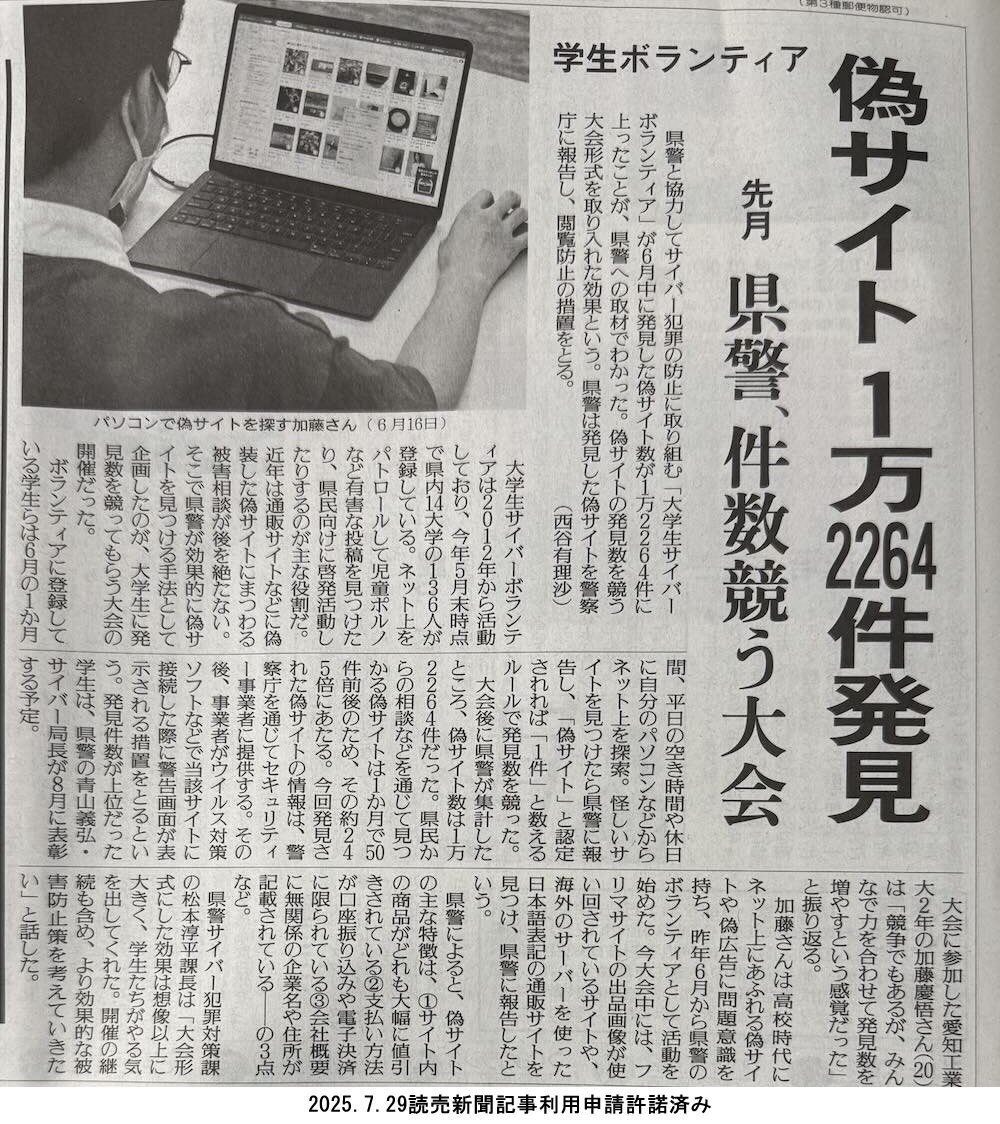 新聞に本学のサイバーボランティア学生が掲載されました 2025.08.20 メディア掲載 2025年7月29日付読売新聞に、大学生サイバーボランティア活動の成果が評価され、加藤慶悟さん(情報科学部情報科学科コンピュータシステム専攻2年)が掲載されました。 前の画面に戻る