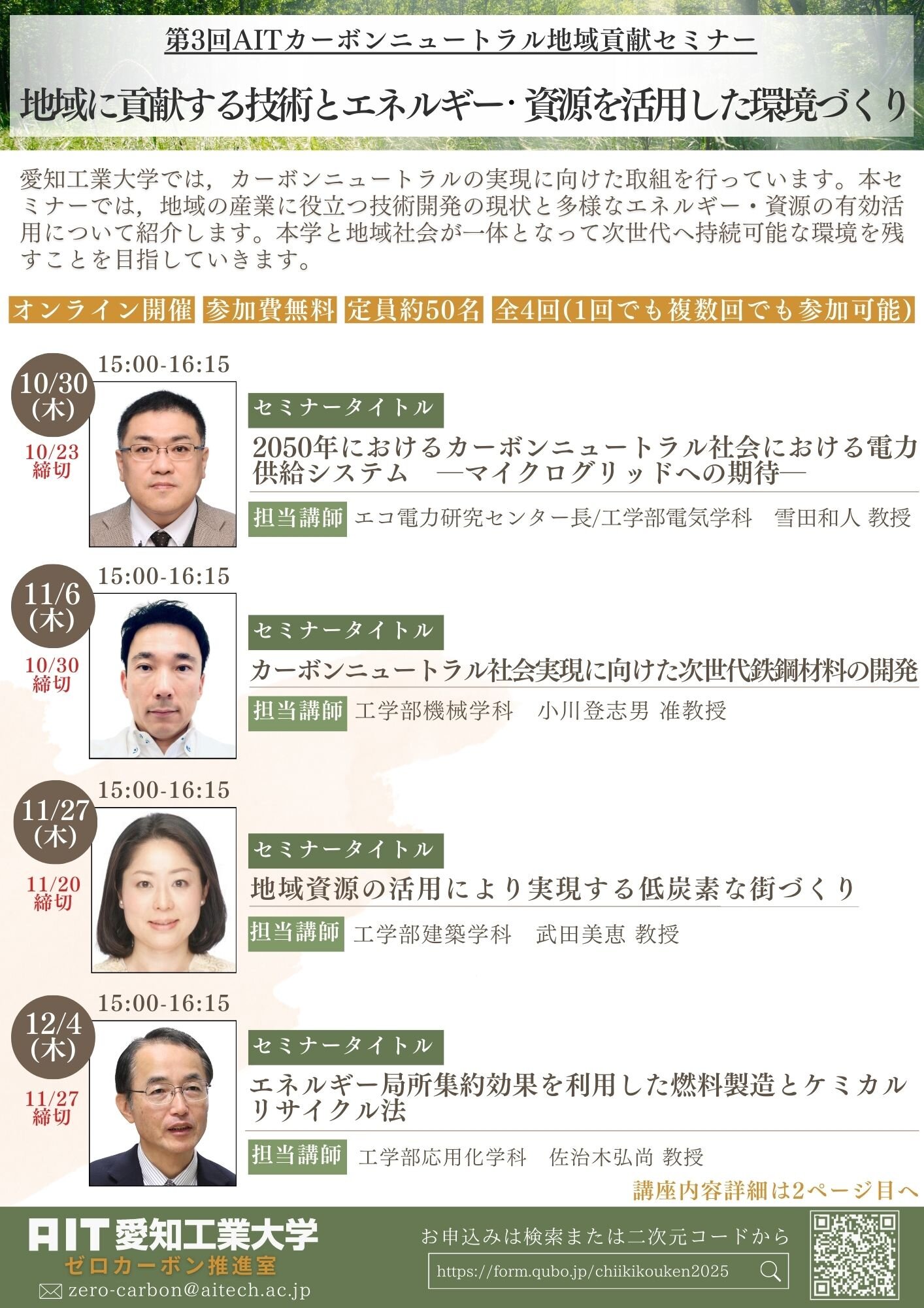 昨年度に引き続き、愛知工業大学はAITカーボンニュートラル地域貢献セミナーを開催いたします。本学は、本セミナーをとおしてカーボンニュートラルの実現に向けて何をすべきなのかを皆様と一緒に考え、行動し、地域社会の明るい未来へとつなげていきます。