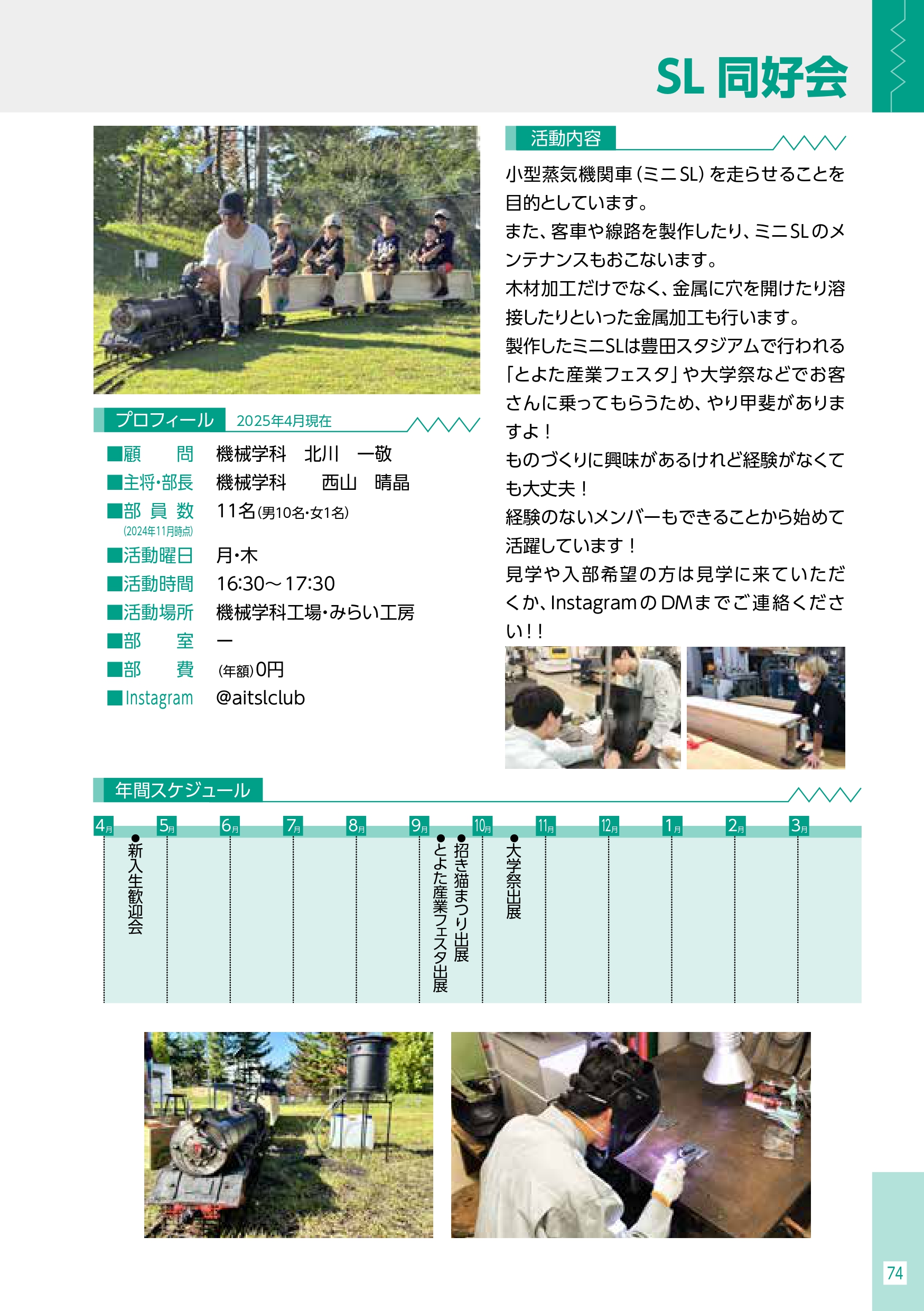 SL同好会は、愛知工業大学が保有している小型蒸気機関車を修繕して様々なイベントで体験試乗を行っています。修繕では、岩倉市にあるミニSL部会と技術交流会を行い専門的な指導を受けながら機体を修理しています。蒸気機関は現在工業的に使用している現場はないため資料やノウハウがなく、高度な工学にて設計されている蒸気機関車のメカニズムは理解するだけでも一苦労です。技術の伝承には時間と根気が必要なため我々はしっかりと技術を学び、活動を行っています。