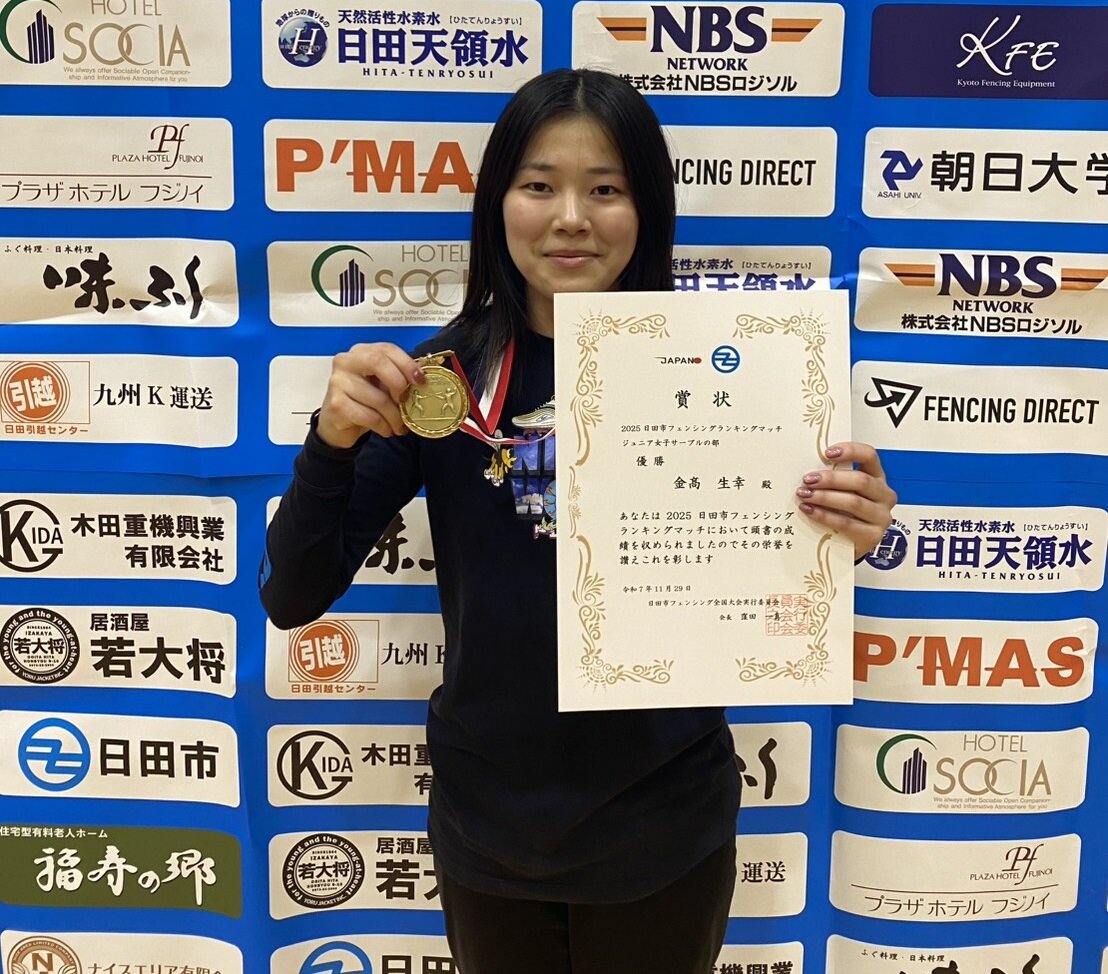 2025年11月29日(土)、大分県日田市で開催された「2025日田市フェンシングランキングマッチ」において、フェンシング部の金髙生幸(経営学部経営学科 1年)がジュニア女子サーブルで優勝しました。