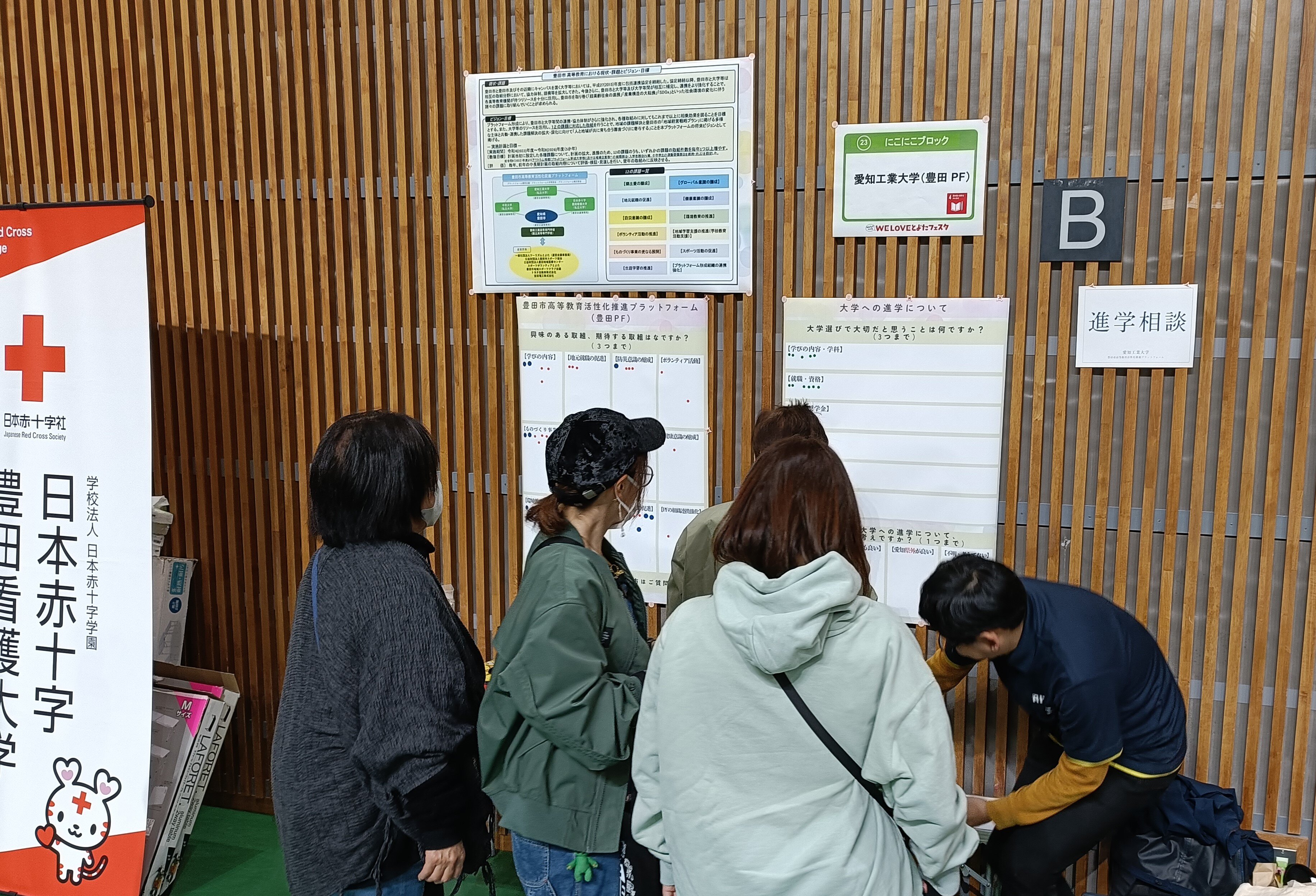 ブースでは、本学、中京大学、日本赤十字豊田看護大学が協力し、合同の進学相談・大学案内コーナーも設けました。当日は、将来「科学者になりたい」という夢を持つ小学生が相談に訪れる一幕もありました。スタッフから、夢を叶えるために今から取り組める学習方法や、本学が主催する「ものづくりイベント」への参加を提案するなど、次世代を担う子どもたちとの有意義な交流の時間となりました。隣接する日本赤十字豊田看護大学や中京大学のブースでも、多くの参加者が学生スタッフとの交流や出展内容を楽しんでおり、プラットフォーム全体でアピールすることができました。