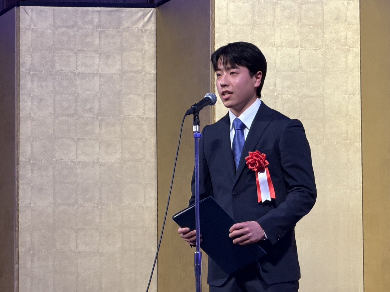 3月9日、東海地方の財界人でつくる親睦団体「丸八会」の3月例会が名古屋市内のホテルで開催され、昨年5月の世界卓球選手権男子ダブルスで日本勢として64年ぶりの金メダルに輝いた本学卓球部の篠塚大登選手が、第38回顕彰を受けました。